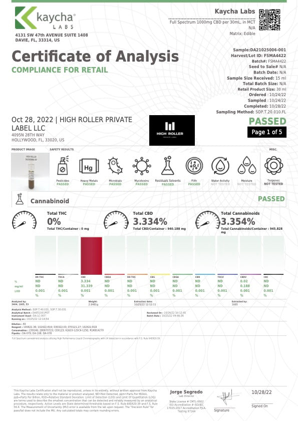 Servings: Serving Size 1/ML 30 Servings Per Container. MCT Oil (Full Spectrum), Serving Size: 1 full dropper (1mL), Total Servings: (30), Approx. 33.3mg CBD per full dropper,